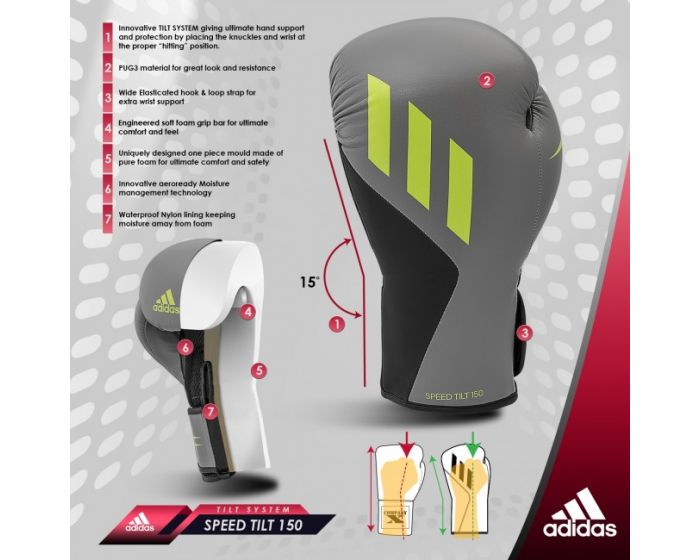 Die neuen Speed Tilt 150 Boxhandschuhe von adidas sind aus einem hochwertigem FLX 3.0 Kunstleder hergestellt. Die vorgeformte, einteilige Schaumstoffpolsterung bringt deine Handgelenke in die richtige Schlagposition und garantiert somit optimale Dämpfung und ultimativen Schutz deiner Fäuste.